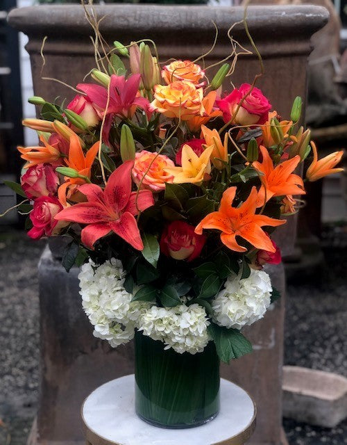 In a tall cylinder glass vase a bed of white hydrangea, a mix of pink lilies and roses and orange roses and lilies. Perfect for same day delivery.