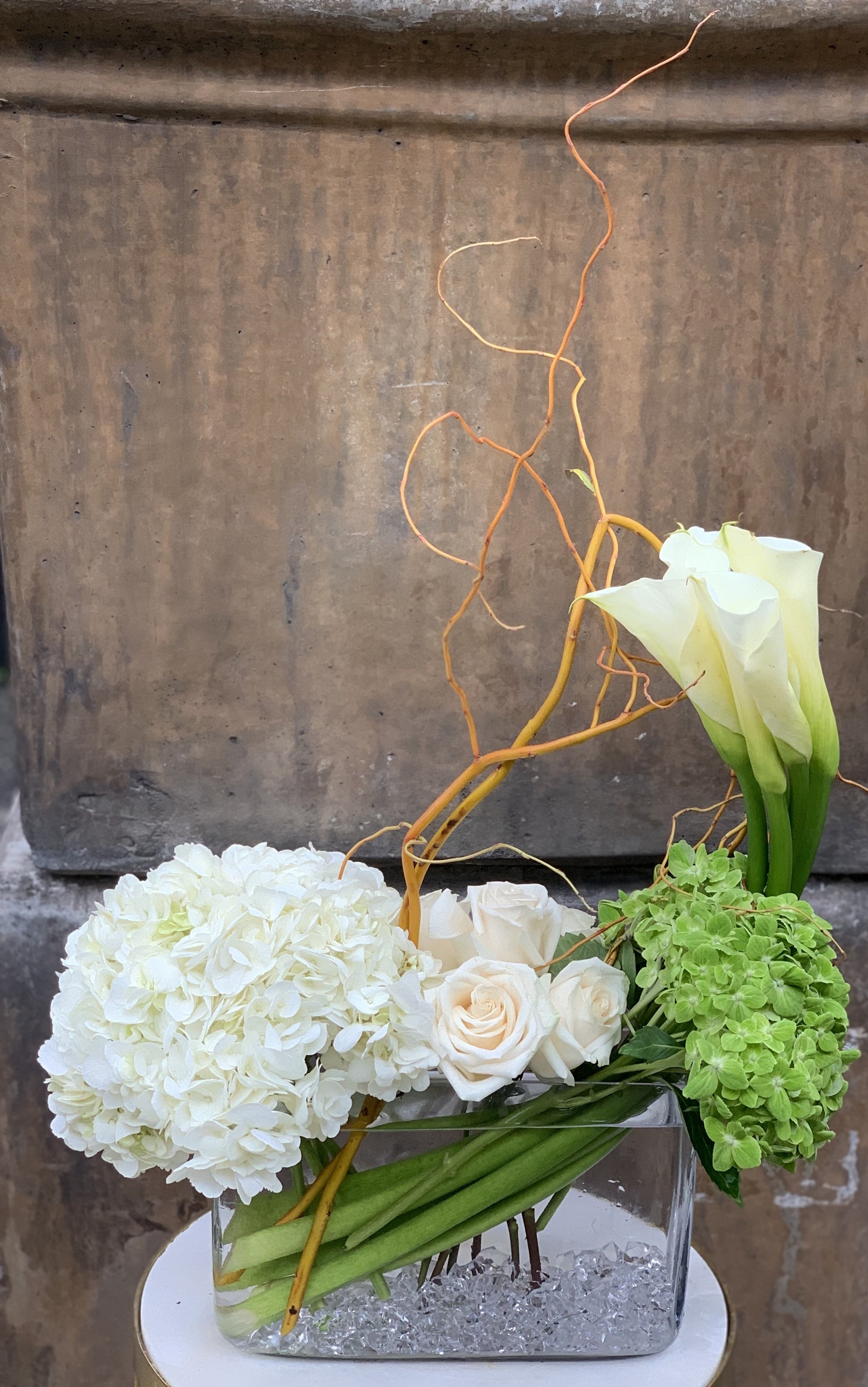 In an envelope vase, white & green hydrangea, blush roses, white calla lilies, curly willow and rocks.