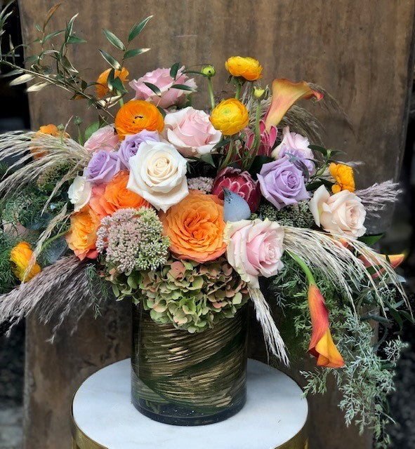 A medium Cylinder glass vase a mix of green antique hydrangea, gold painted leaves, orange,pink, white and lavender roses, yellow and orange ranunculus, "fire" calla lily, pink protea, sedum,pampas grass and greenery