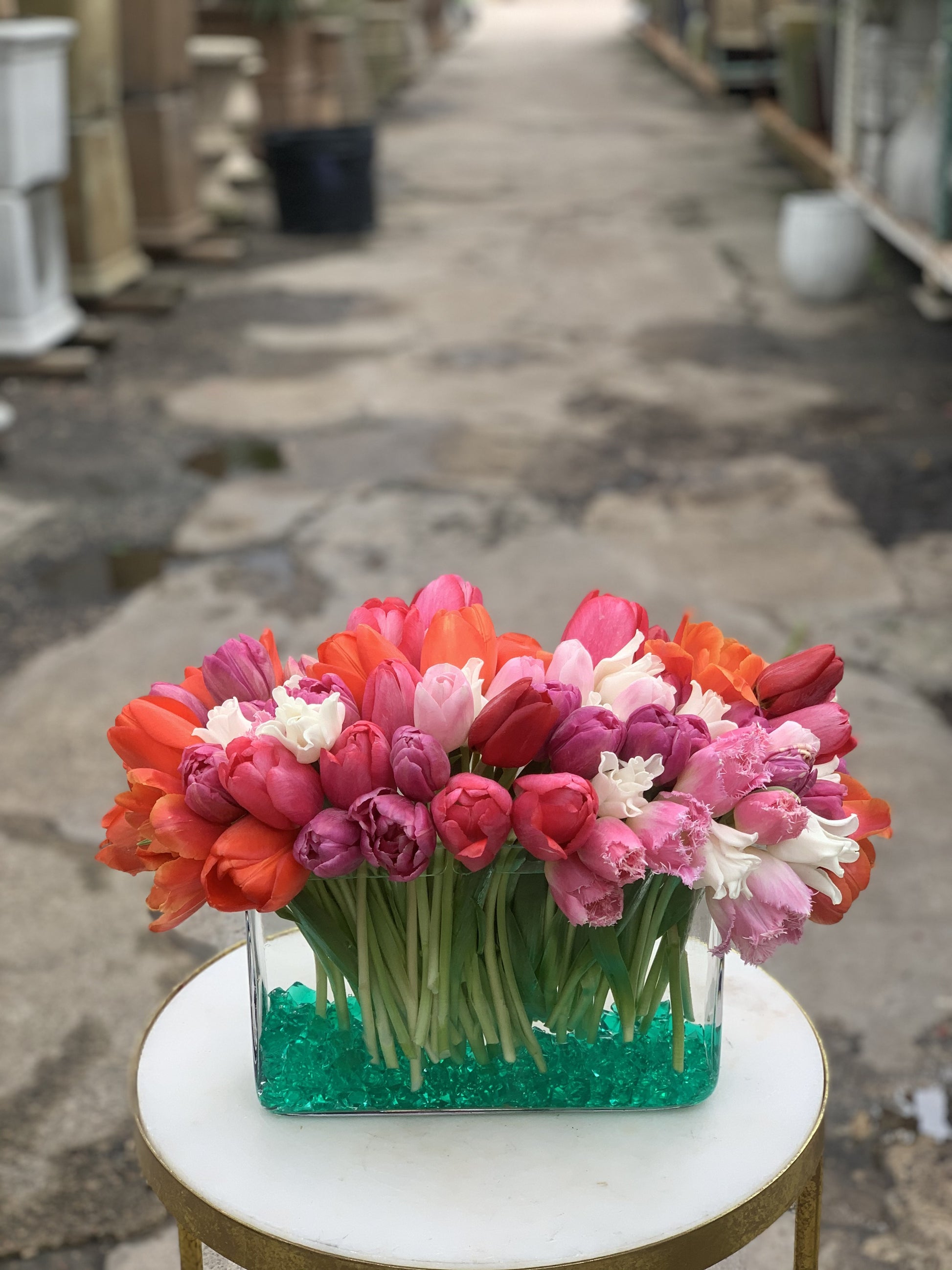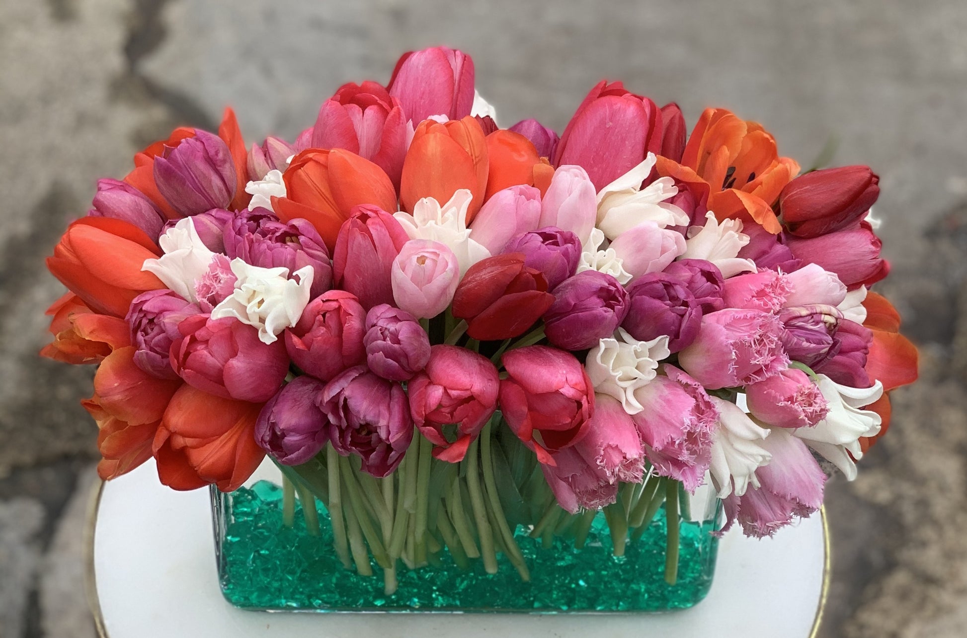 In a long and low rectangular vase with green stones a mix of tulips.