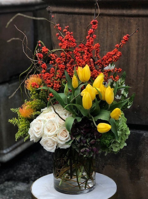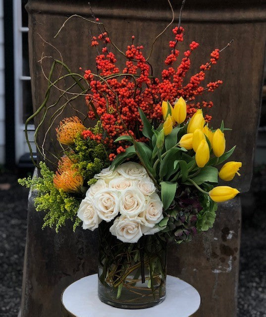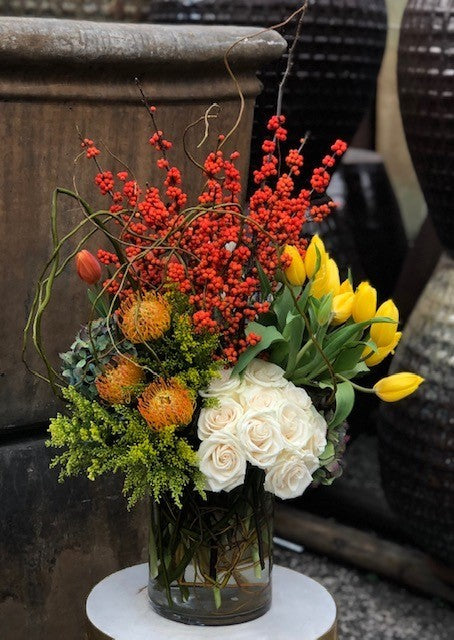 In a medium height cylinder vase a mix of blush roses, yellow tulips, orange protea, antique hydrangea, orange blooming branches, and curly willow.