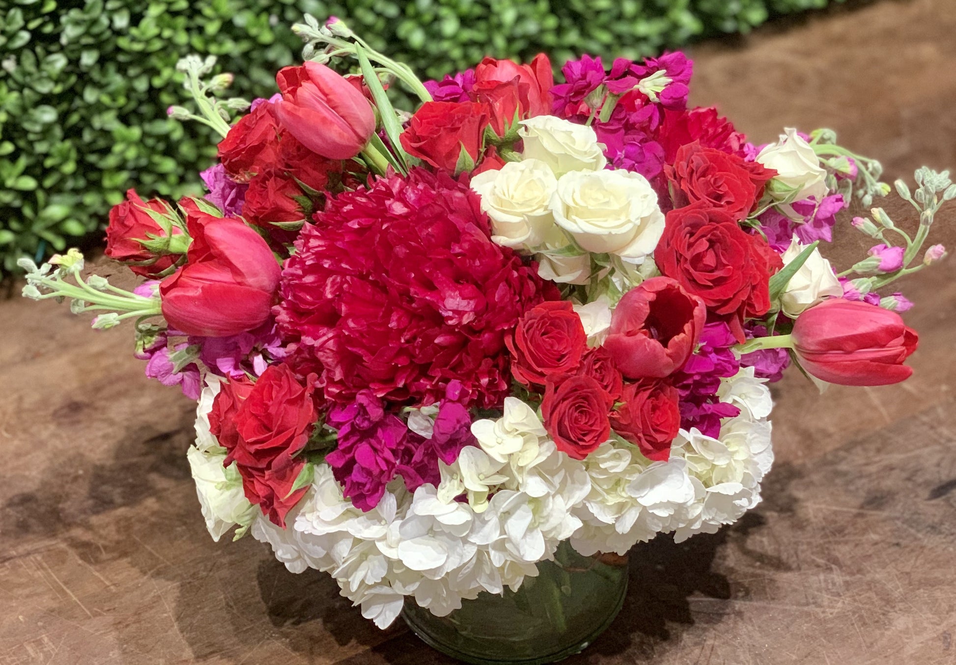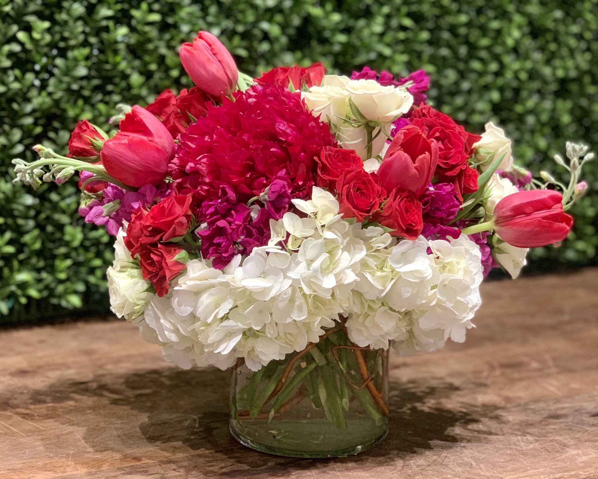 In a medium cylinder vase a mix of white hydrangea, burgundy peonies, red tulips, purple stock, white and pink spray roses.