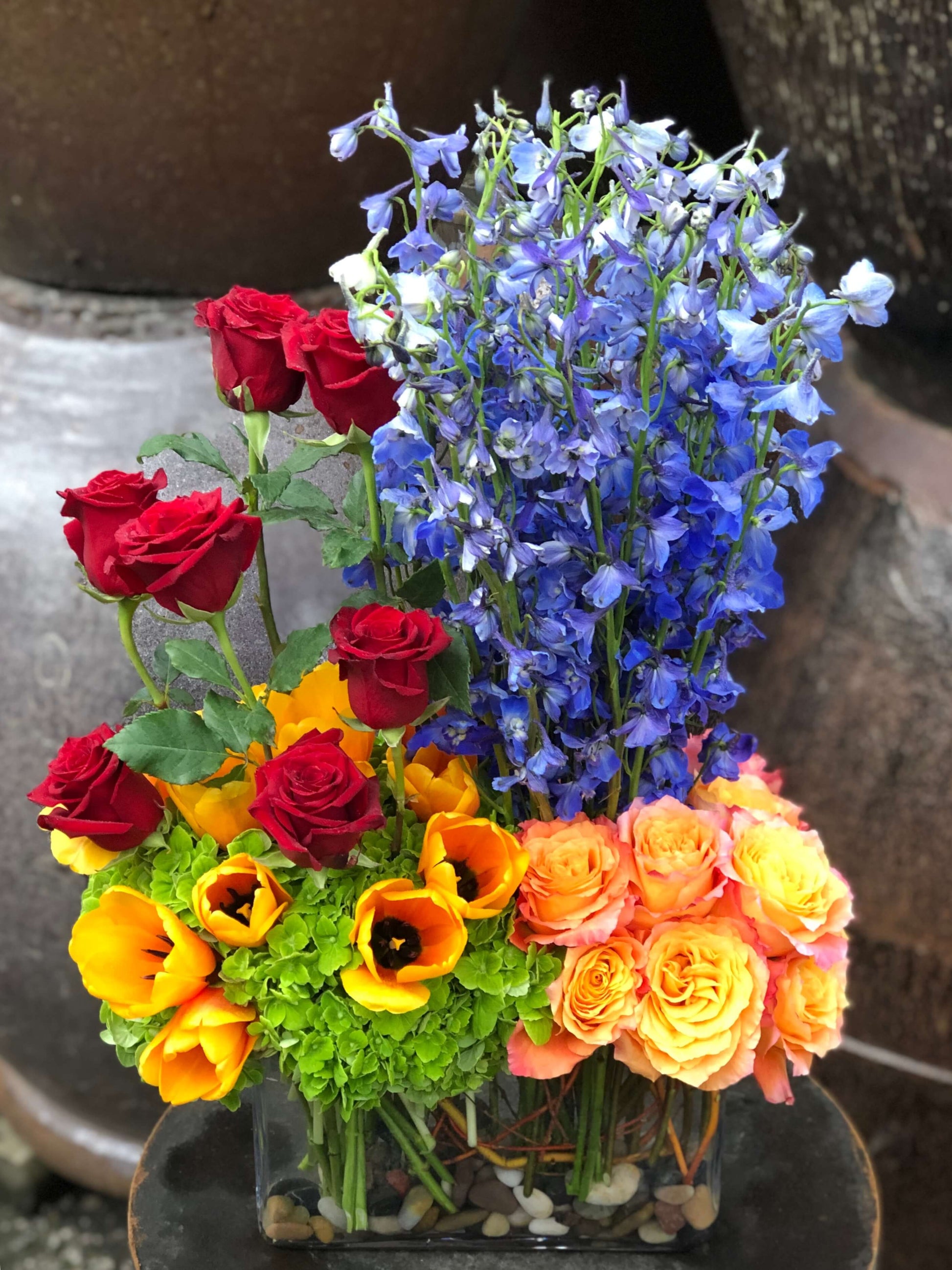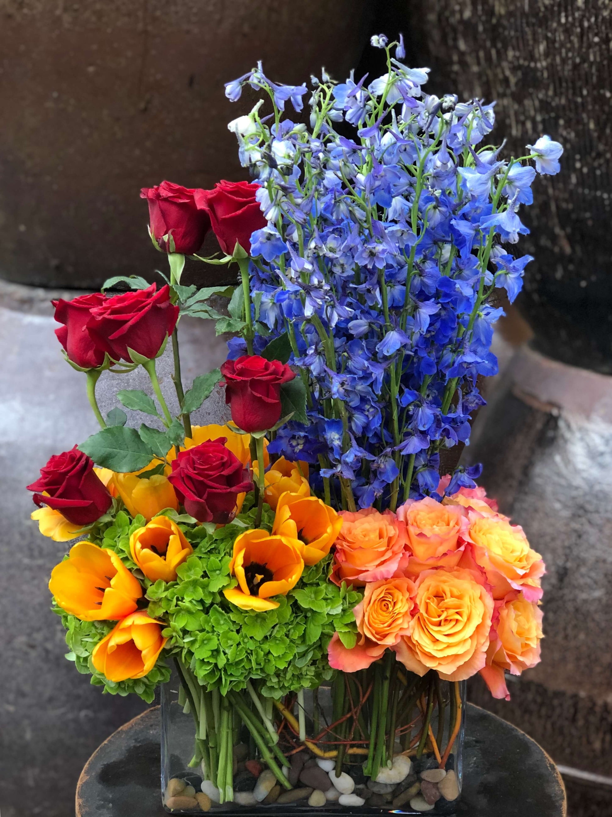 Medium height arrangement of colorful tulips, roses and delphiniums. A bold selection of colors consisting of free spirit rose, ruby red rose, green hydrangea, french tulip and delphinium, this arrangement demands the attention from anyone looking at her.