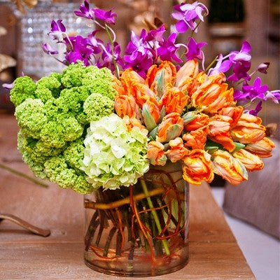 Parrot Tulips, Green Hydrangea, Green Viburnum, Dendrobium Orchids in a cylinder make for a happy arrangement.