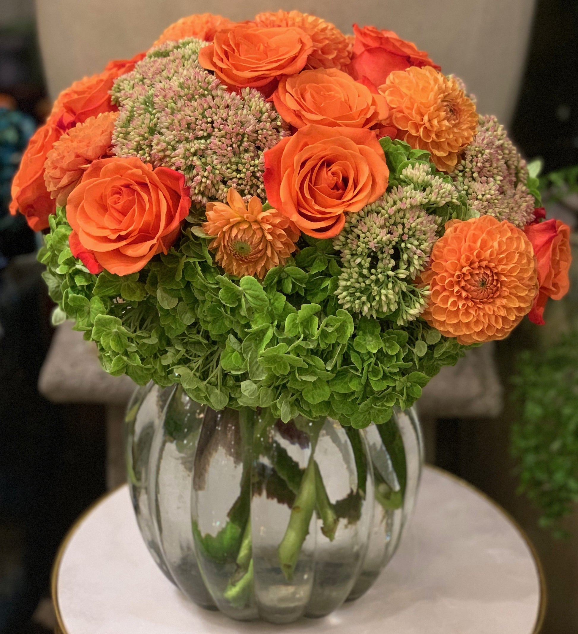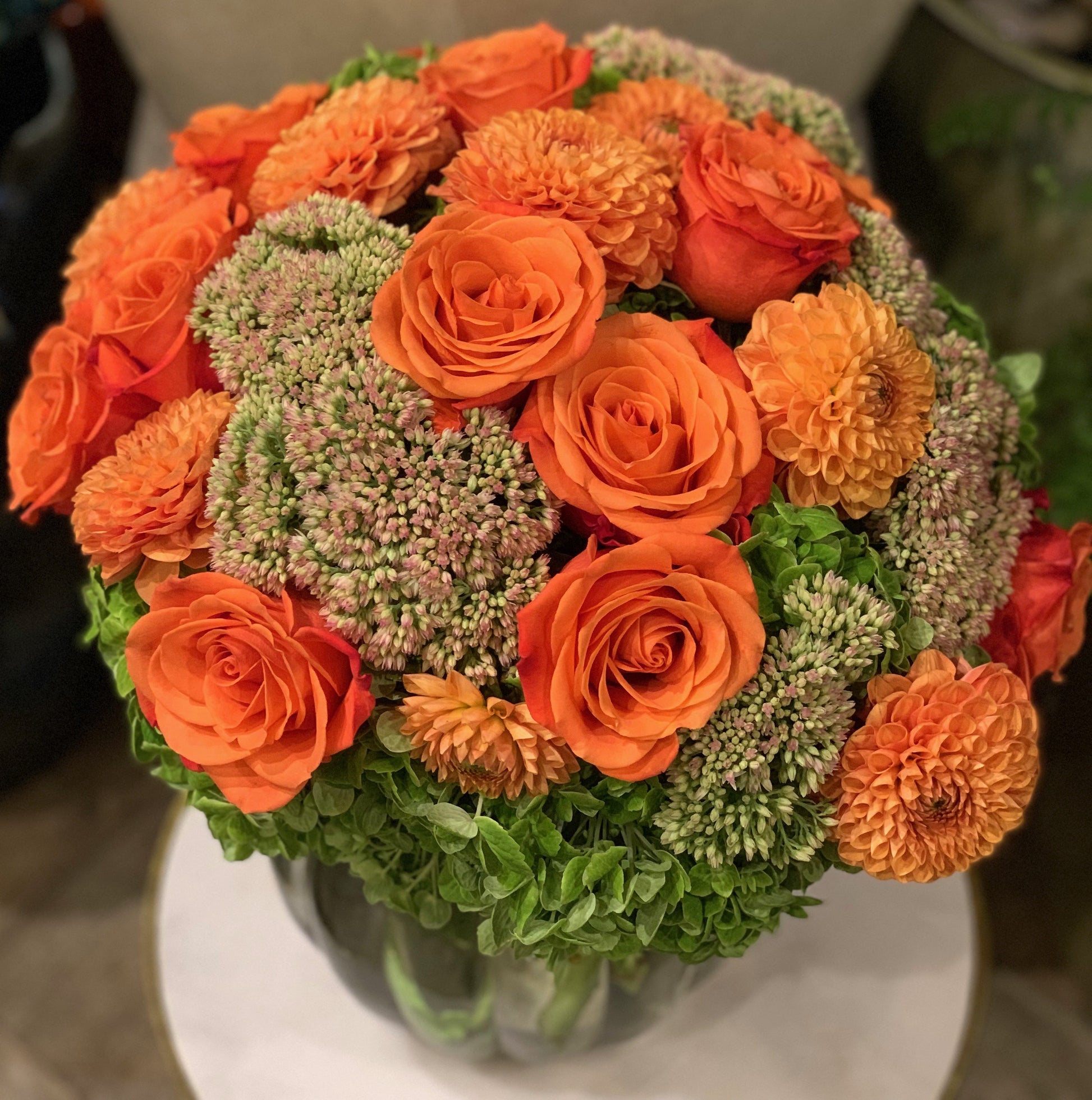 In a medium height bubble vase a mix of green hydrangea, orange roses, orange dahlias and filler. * Same Day Delivery*