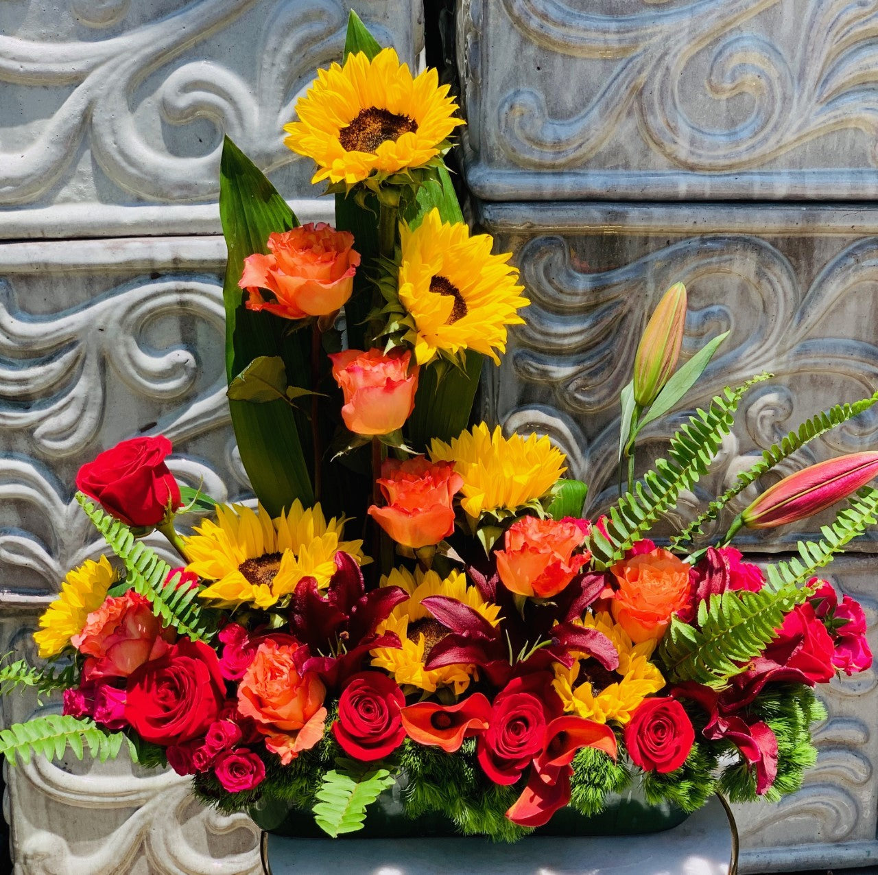 In a long and low rectangular vase a bed of green trick with designed look of res spray roses, orange and red roses, sunflowers, red lilies, Green fern and banana leaf