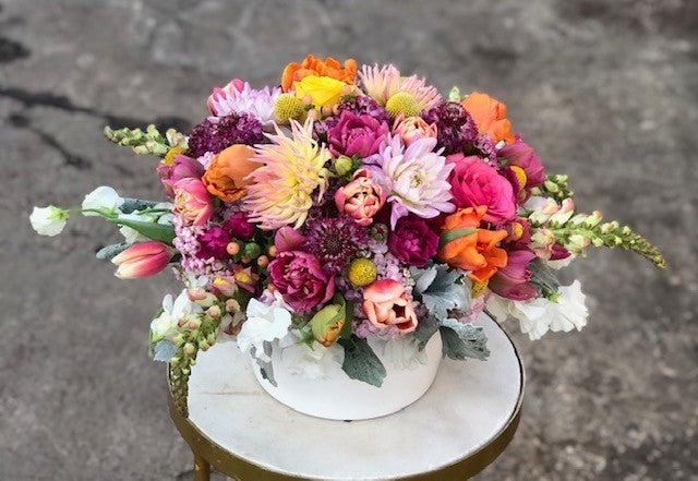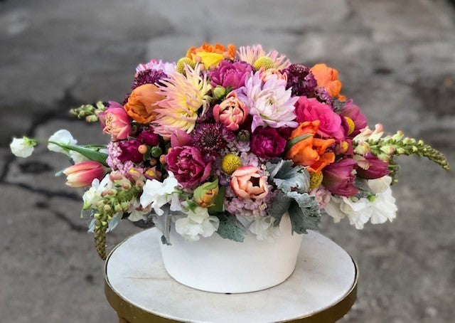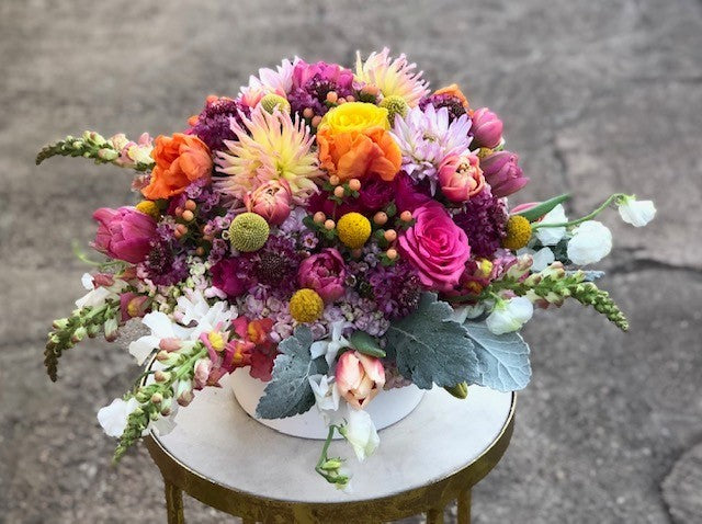In a cylinder white ceramic vase a mix of pink popcorn hydrangea, pink snapdragons, purple scabiosa, pink, orange & purple tulips, Purple & yellow roses, lavender and yellow dahlias, pink berries, white sweet pea, yellow billy balls and dusty miller.