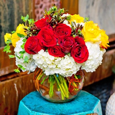 Red Roses, Yellow Roses, White Hydrangea, in Glass Bowl with curly willow.