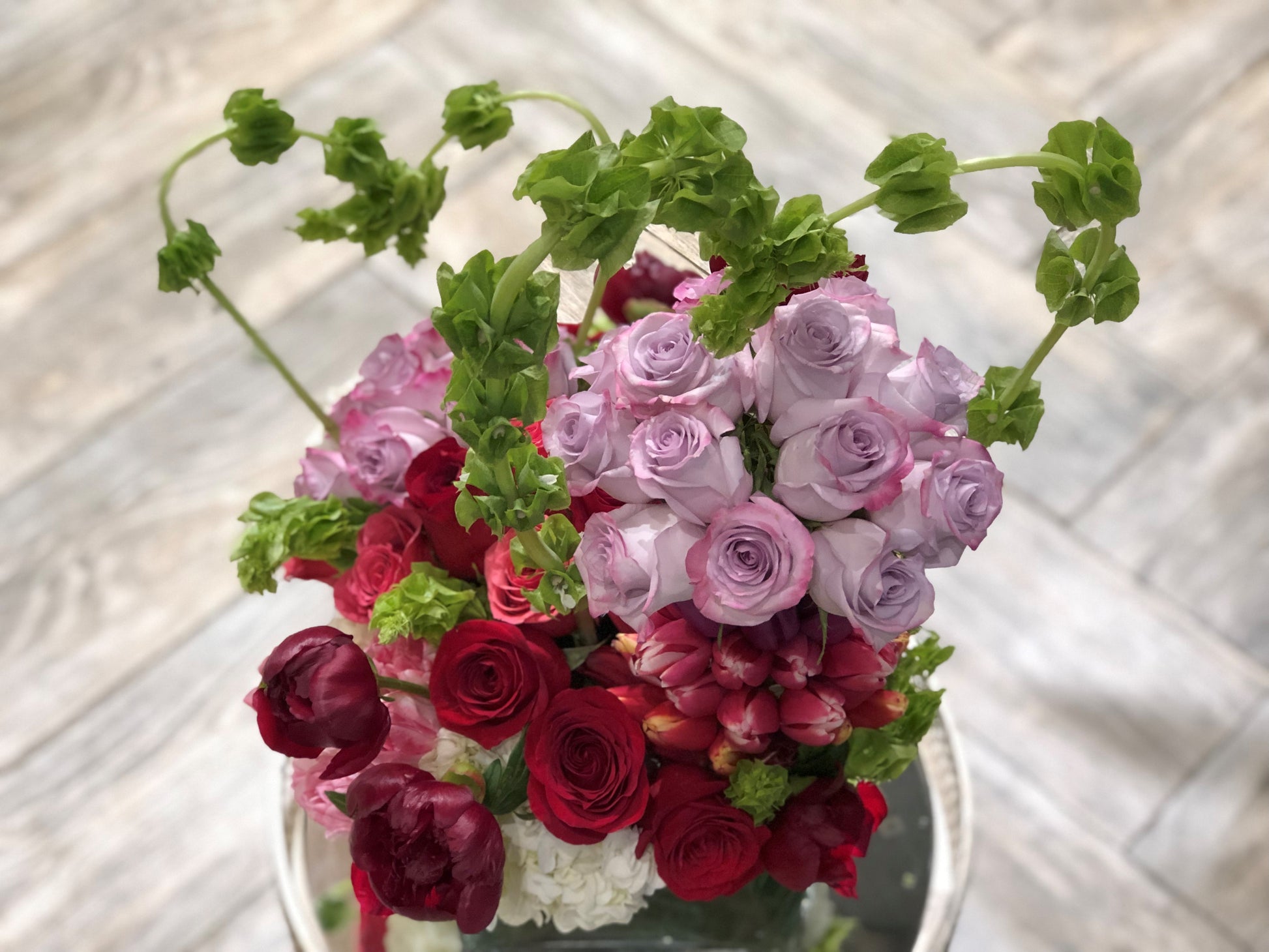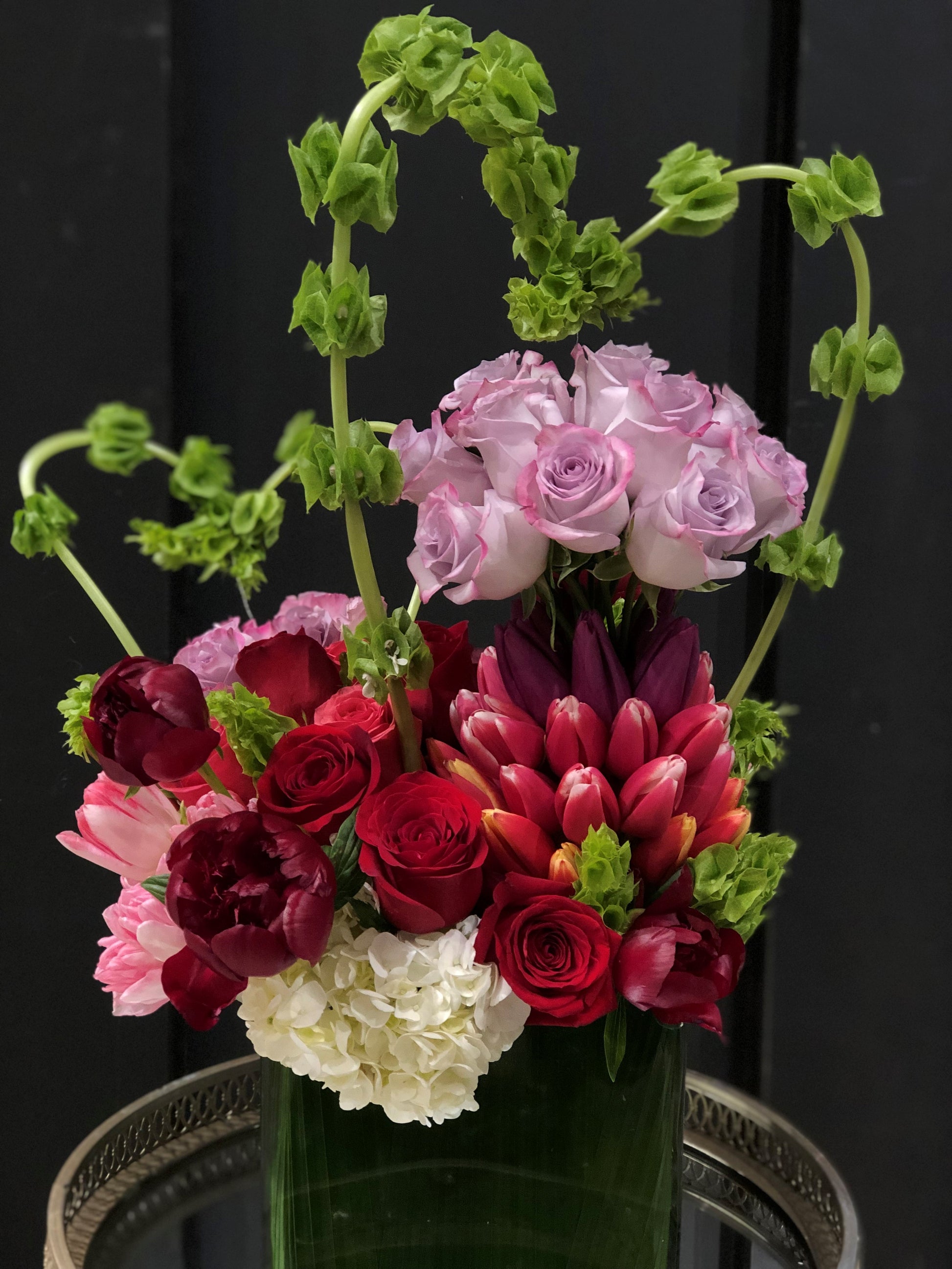 Leaf lined cube with hydrangea, roses, peonies, tulips and bells of ireland shaped into hearts