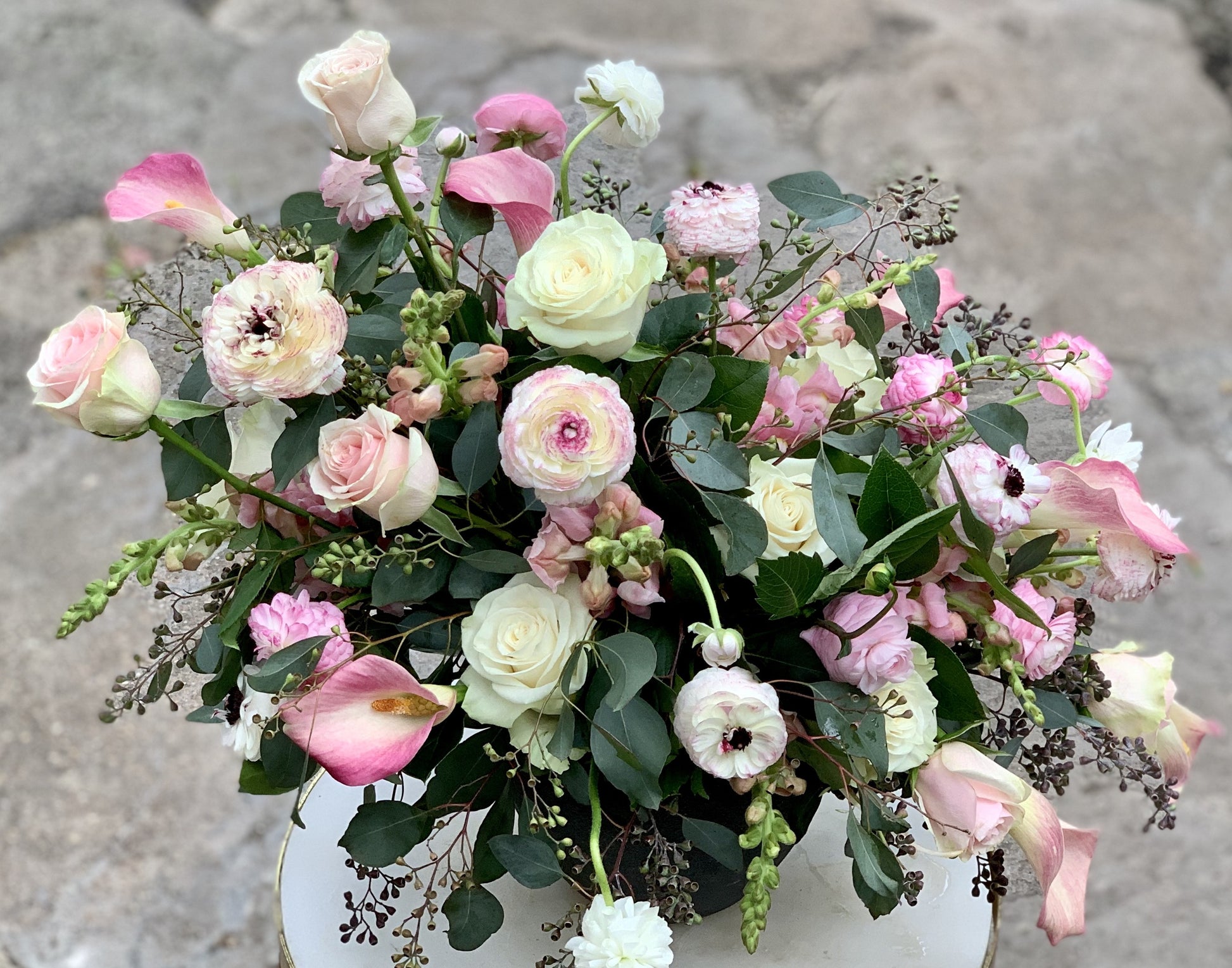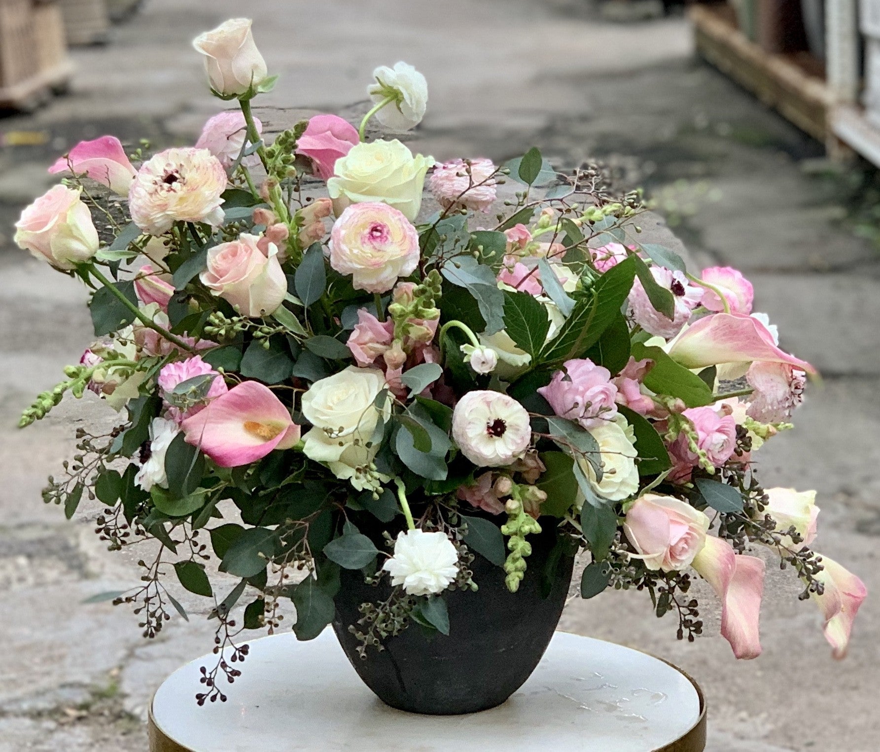 Beautiful blush and white roses, pink and white ranunculus, pink calla lilies, pink snap dragons, & seeded eucalyptus in a graphite pot.