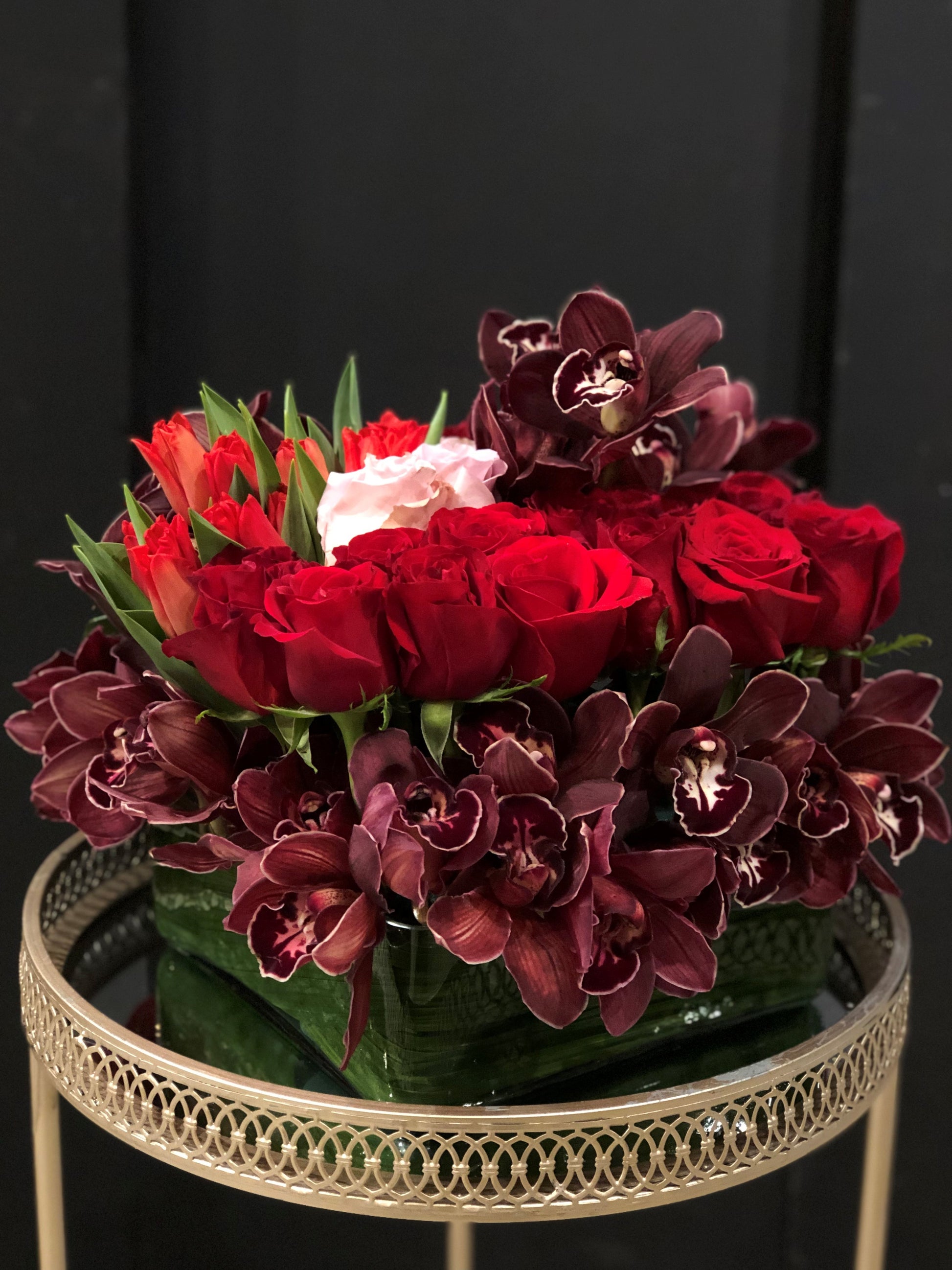 Large low cube, leaf lined, mix of cymbidium orchids, roses and tulips