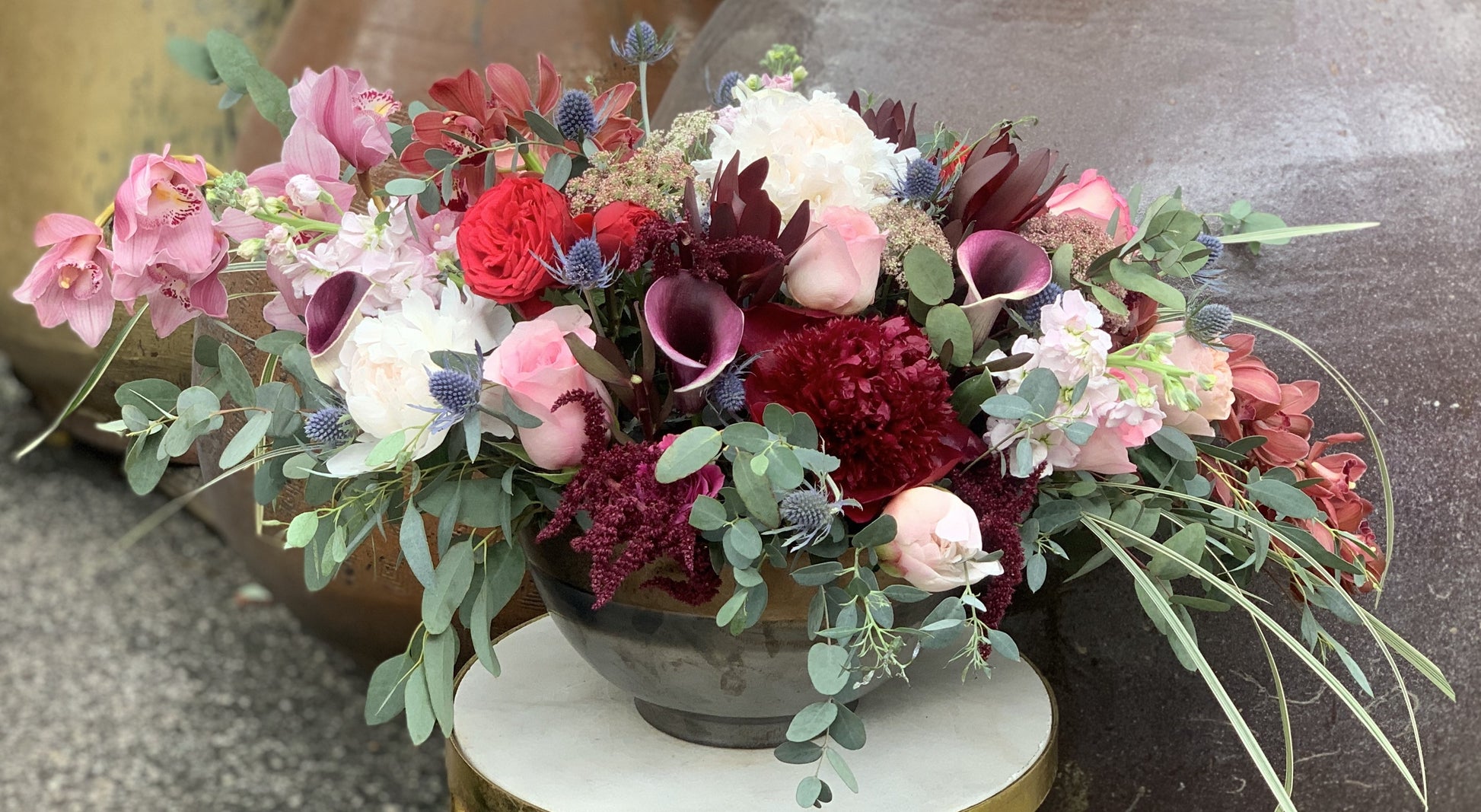 In a two toned ceramic vase a mix of pink & burgundy peonies, burgundy calla lilies, red roses, pink stock, blue thistle, queen annes lace, cymbidium orchids and seeded eucalyptus.