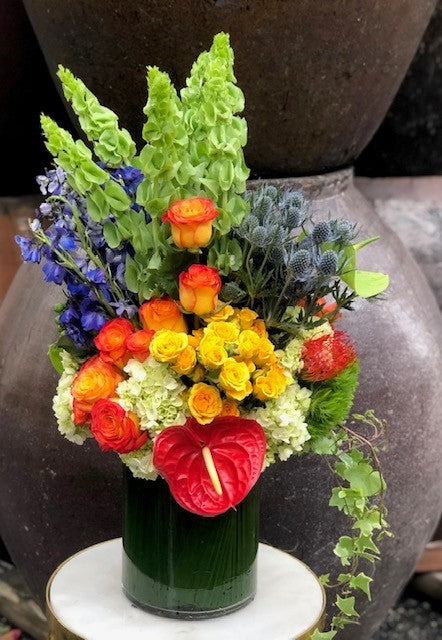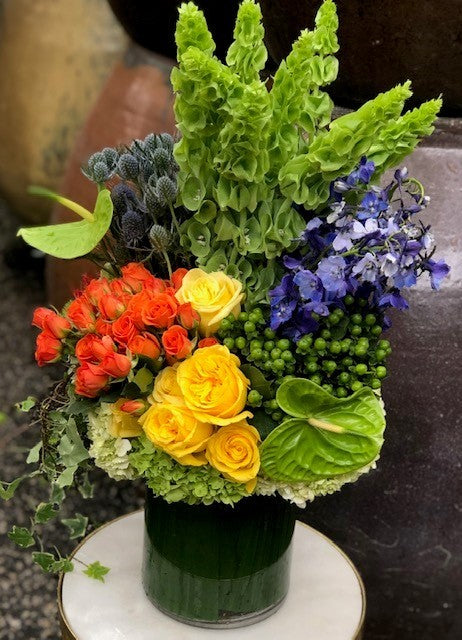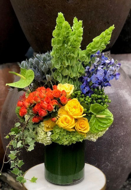 In a medium cylinder glass vase a mix of white hydrangea, green trick, yellow roses, green bells of ireland, blue delphinium, blue thistle, orange roses and hanging ivy.