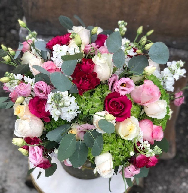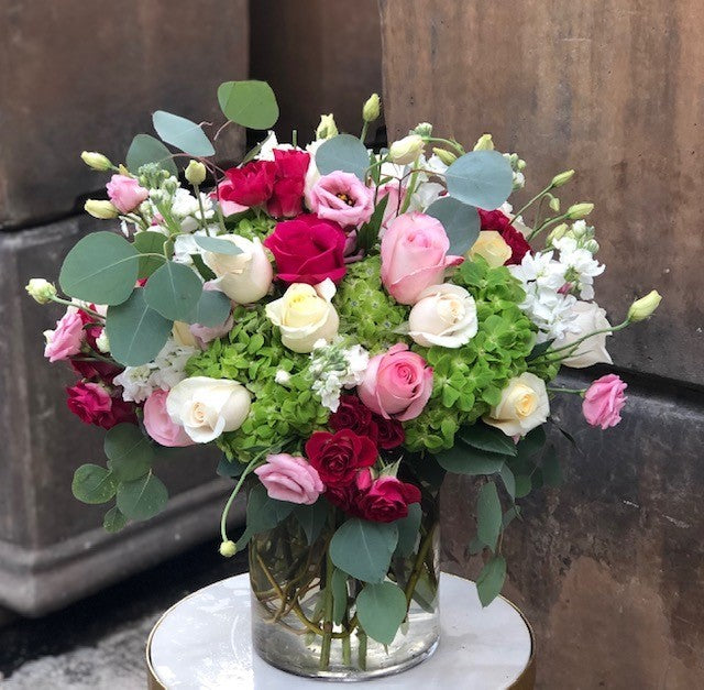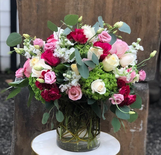 In a med-height glass cylinder, a mix of green hydrangea, white, pink and hot pink roses, pink lisianthus, white stock, and eucalyptus.