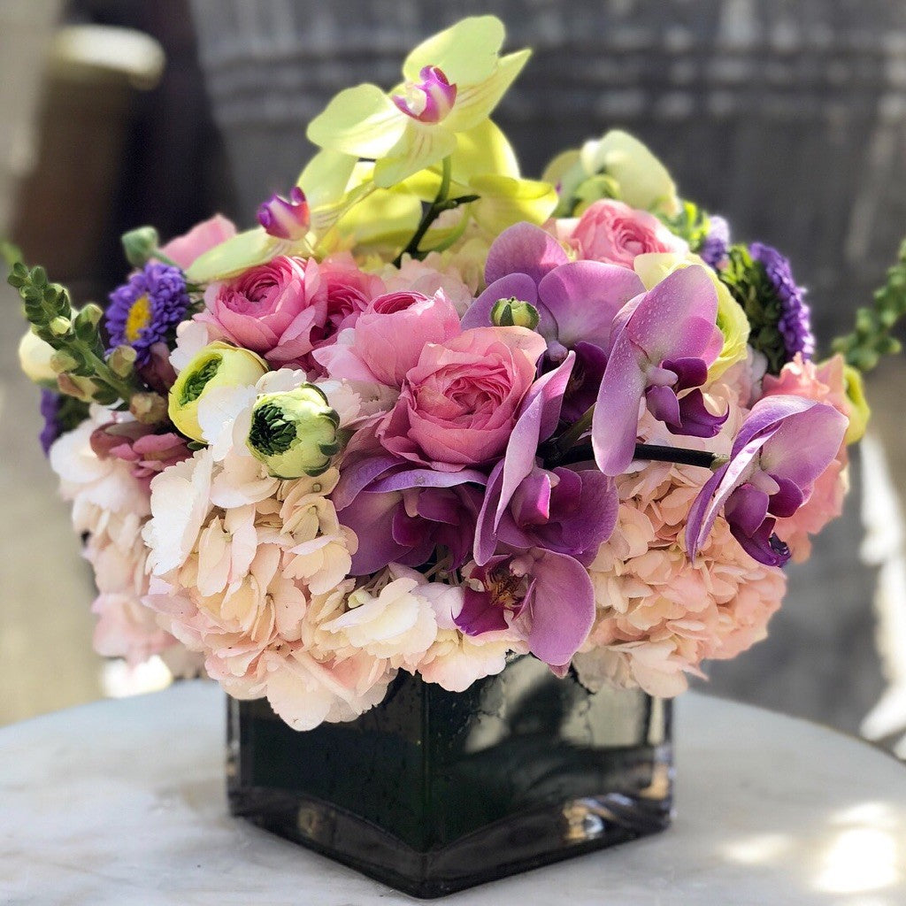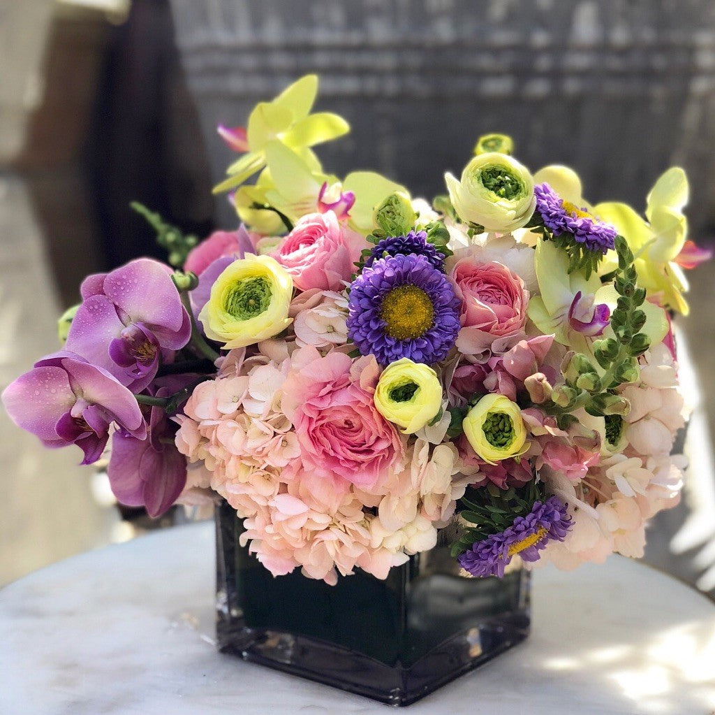 Soft Colors / Luxurious Design / Pastels / Low and Lush in a square glass vase. H:10" W:8"