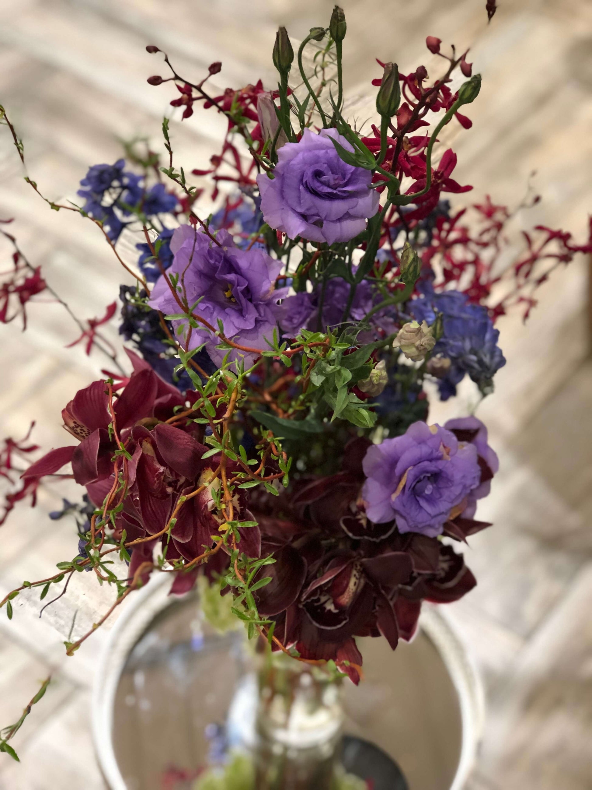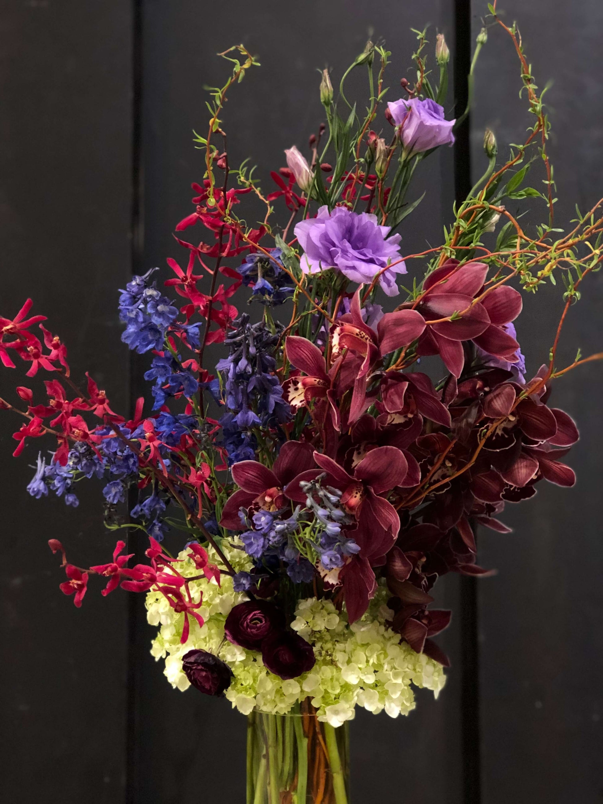 The wanderlust incorporates burgundy Cymbidium Orchids, wild Dendrobium Orchids, burgundy Ranunculus, wild Delphiniums, jasmine Lisianthus and Curly Willow to make a dramatic statement. She is the perfect for someone who has a free spirit and a desire to adventure.