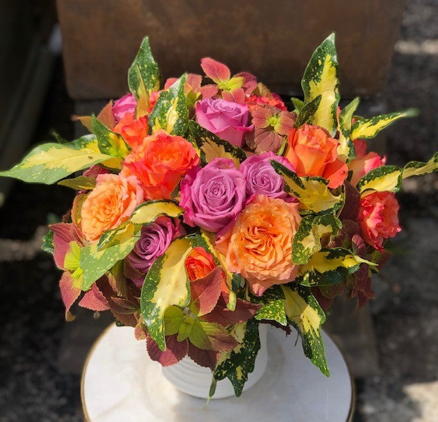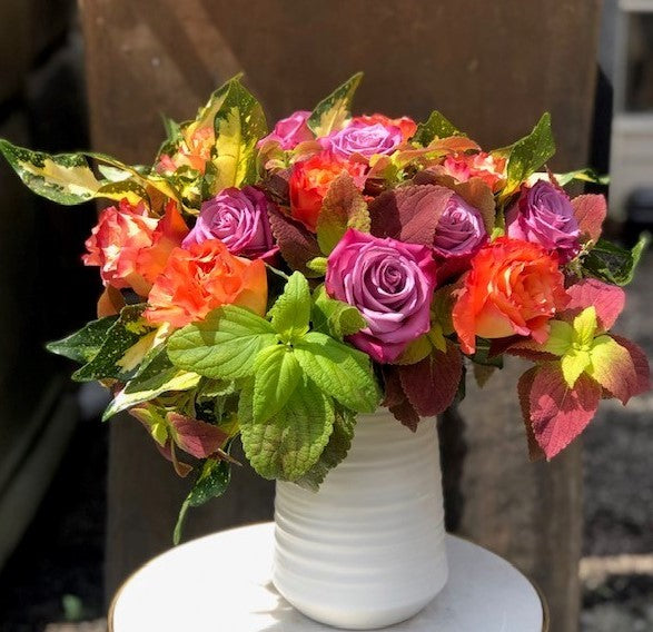 A collection of orange beautiful orange and lavender roses, adorn with a touch of variegated leaves in a white vase. This bright and cheerful arrangement is ready for delivery today
