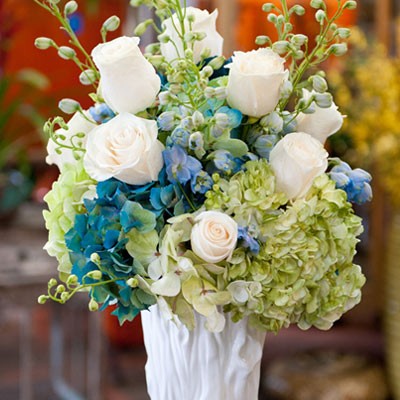 A collection of beautiful blue delphinium, roses and light green hydrangea in a ceramic vase. **note some flowers and vases based on availability.