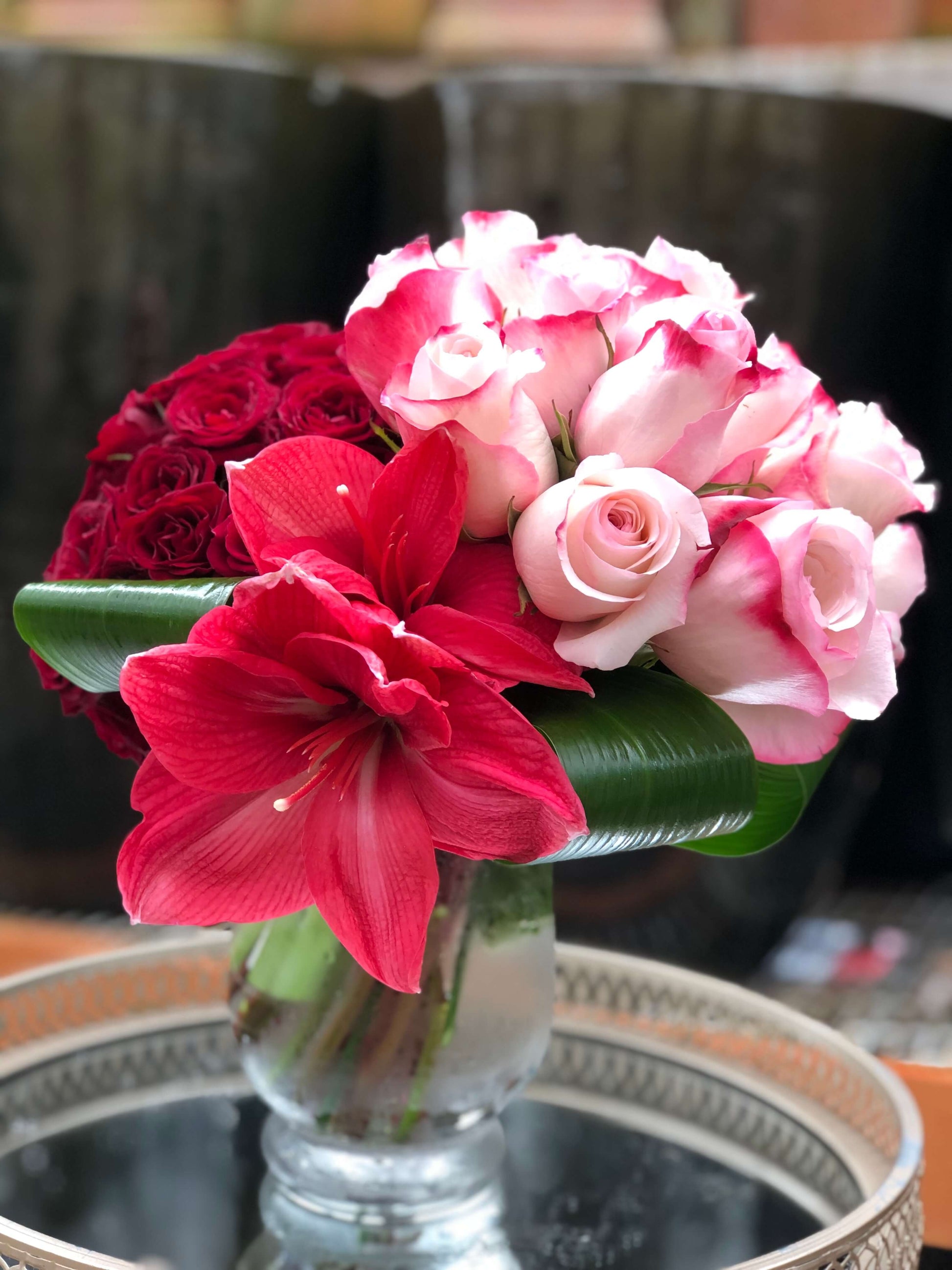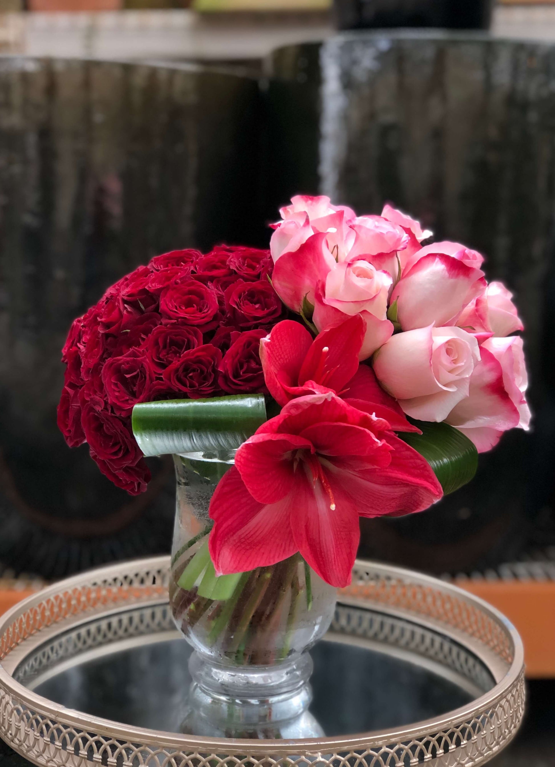 A bold ball of deep ruby red spray roses and a gentle bouquet of soft pink roses combined with a touch of seasonal amaryllis to create an unforgettable statement for your loved one.