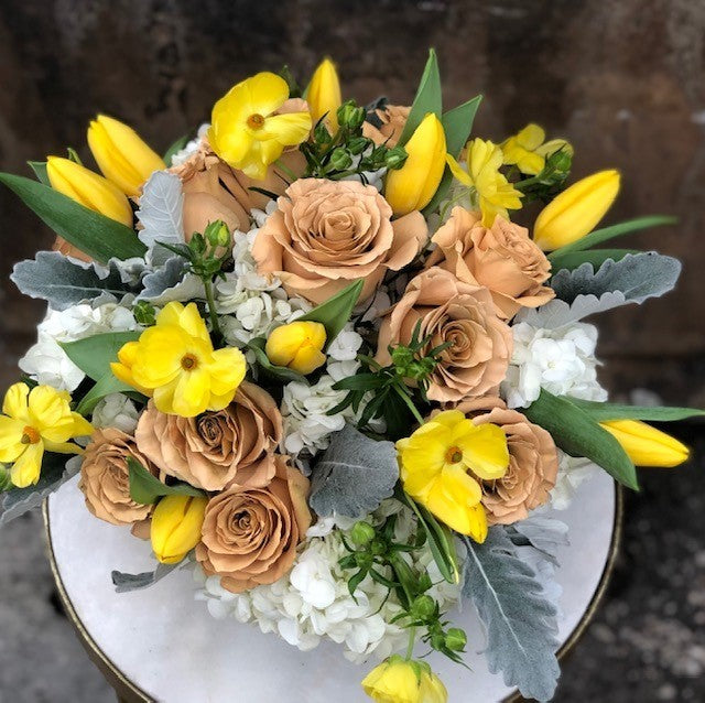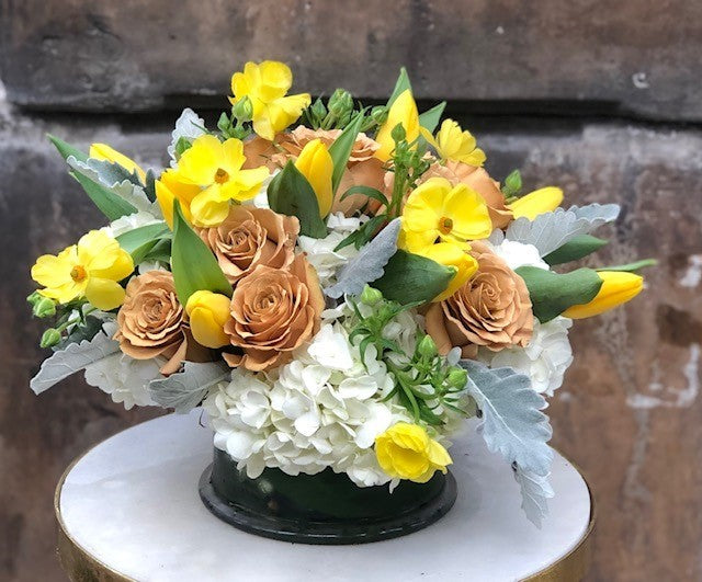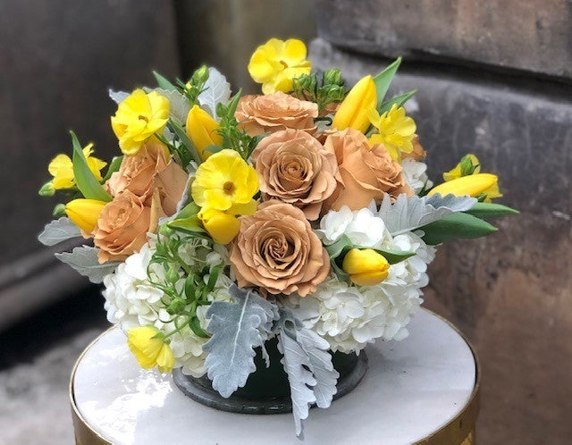 In a low cylinder vase a mix of white hydrangea, brown roses, yellow ranunculus, yellow tulips and silver greenery.