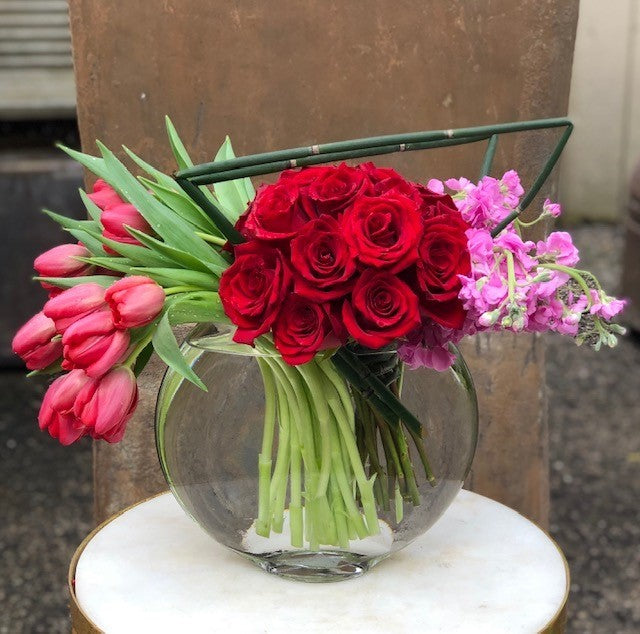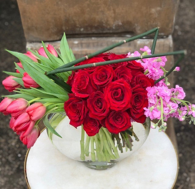 In a Half moon glass vase a cluster of red tulips, cluster of red roses and a cluster of pink stock with a unique form of bamboo sticks.