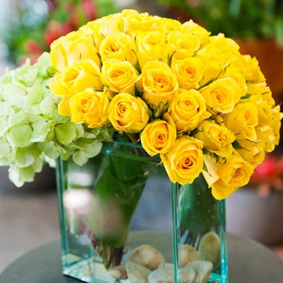 This 3 Dozen Yellow Rose bouquet wrapped in green leaves and accents of Hydrangeas is sure to brighten anyone's day.