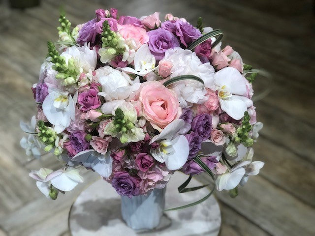 In a beautiful white vase, Light pink hydrangea, pink and purple spray roses, white peonies, pink roses, lavender roses, phalo orchids, white snapdragons and greenery